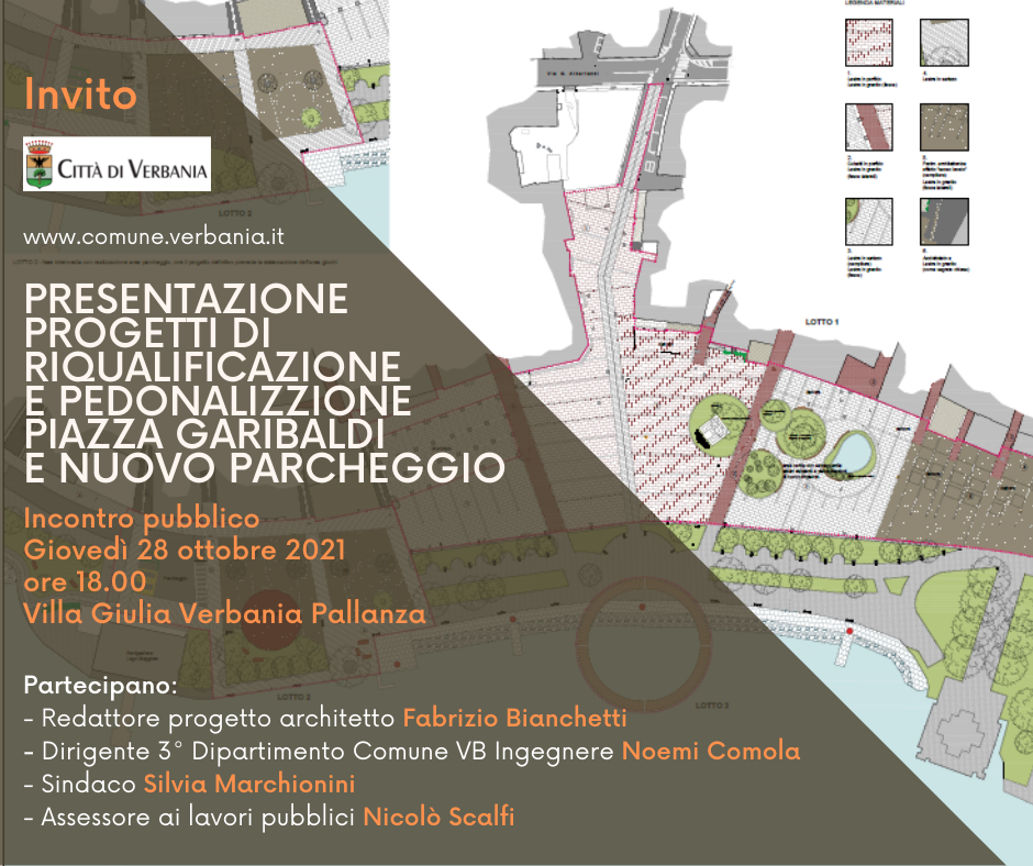 Un confronto per guardare al futuro (prossimo) della nostra città.Giovedì 28 ottobre 2021, ore 18:00 - Villa Giulia, c.so Zanitello Verbania PallanzaIncontro pubblico: presentazione progetti di riqualificazione e pedonalizzazione di piazza Garibaldi e nuovo parcheggio.